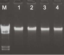 | 從<100mg新鮮(50mg干燥)植物組織中提取DNA 快速:20-50分鐘內(nèi)可以完成一次操作 可靠:獨(dú)特的緩沖系統(tǒng)能夠保證可重復(fù)性強(qiáng) 安全:無(wú)須接觸有害有機(jī)物 性?xún)r(jià)比高:操作簡(jiǎn)單,質(zhì)量穩(wěn)定,價(jià)格低廉 產(chǎn)品原理 快速植物DNA提取試劑盒(FT Plant DNA Kit)是GBCBIO公司特色的植物DNA快速提取試劑盒,單次操作25分鐘內(nèi)完成,對(duì)各種植物樣品有效,純化的DNA可直接用于PCR、酶切和雜交等實(shí)驗(yàn)。提取過(guò)程不需要用到有毒的酚氯仿等有機(jī)物抽提,也不需要用耗時(shí)的異丙醇或乙醇沉淀,純化的基因組DNA幾乎不含有蛋白質(zhì)的污染。 實(shí)驗(yàn)結(jié)果 100mg植物組織經(jīng)FT Plant DNA Kit純化后,基因組 DNA于1.0%瓊脂糖凝膠電泳圖 M:marker 1:生菜葉 2:紅薯葉 3:草莓葉 4:水稻葉 可適用的分子生物學(xué)實(shí)驗(yàn) PCR、限制性酶切、Southern雜交等。 | ![]() |