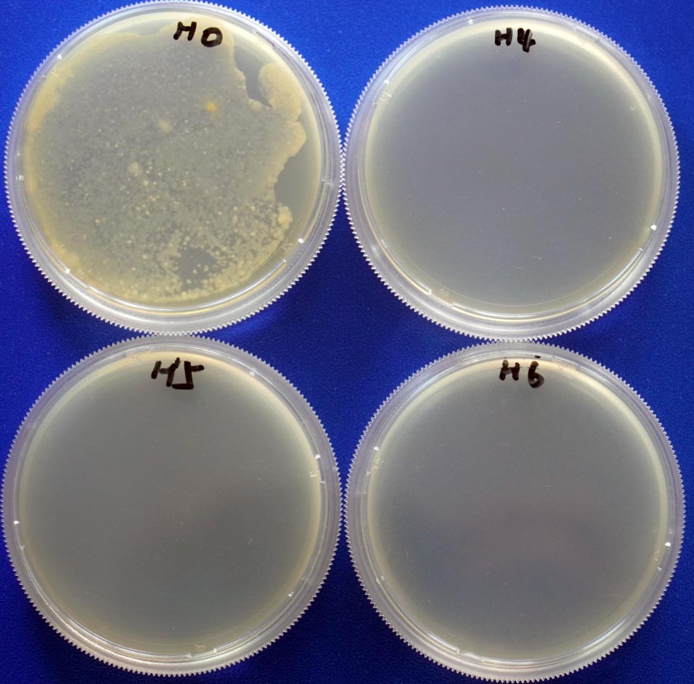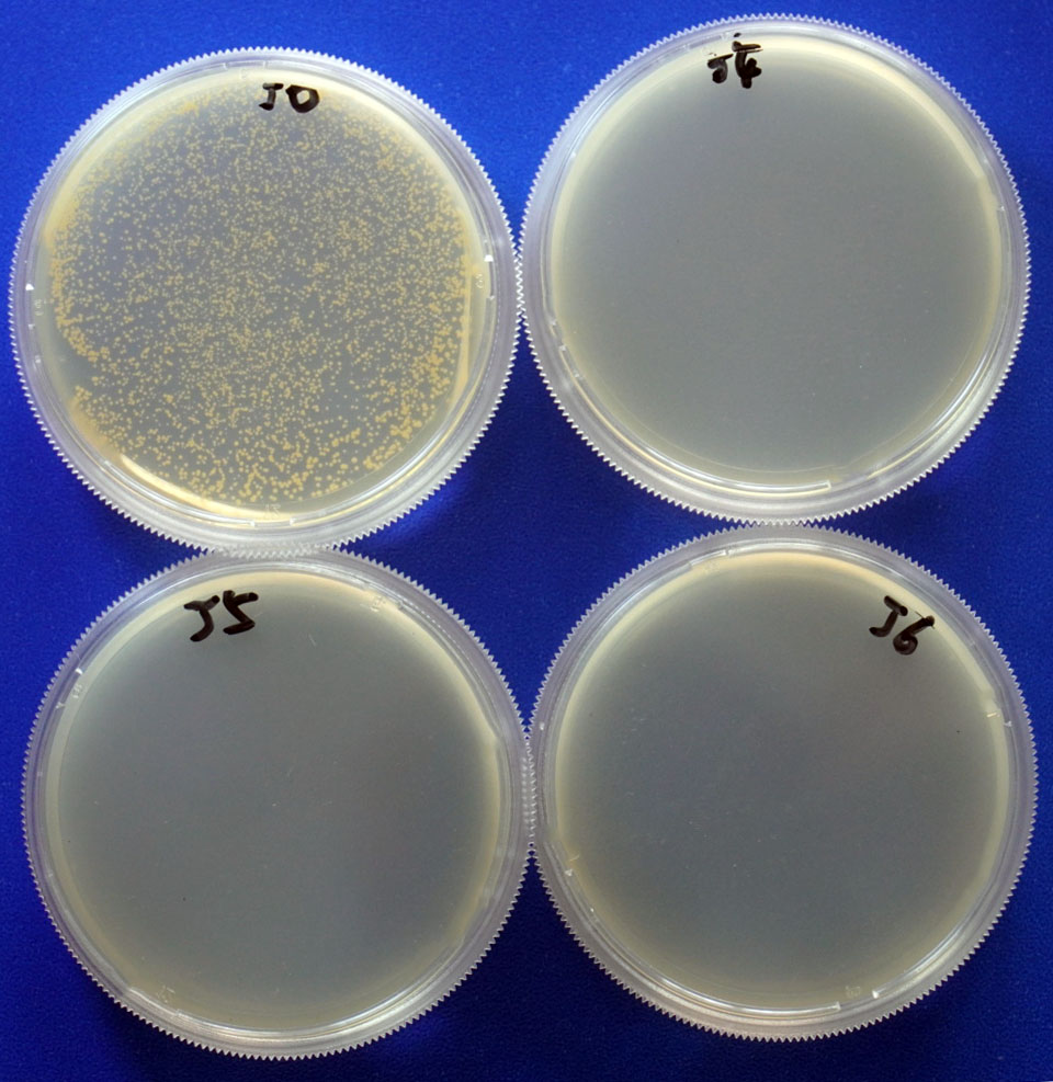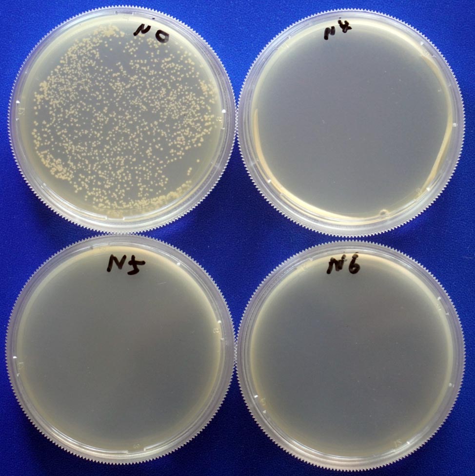 2.1. 對金黃色葡萄球菌的抑制效果(細菌) 培養(yǎng)基高壓滅菌后,冷卻并添加一定量的Buffpro 150后到平板。凝固后接種同樣菌量的金黃色葡萄球菌,37℃培養(yǎng)18h。結(jié)果如下圖: