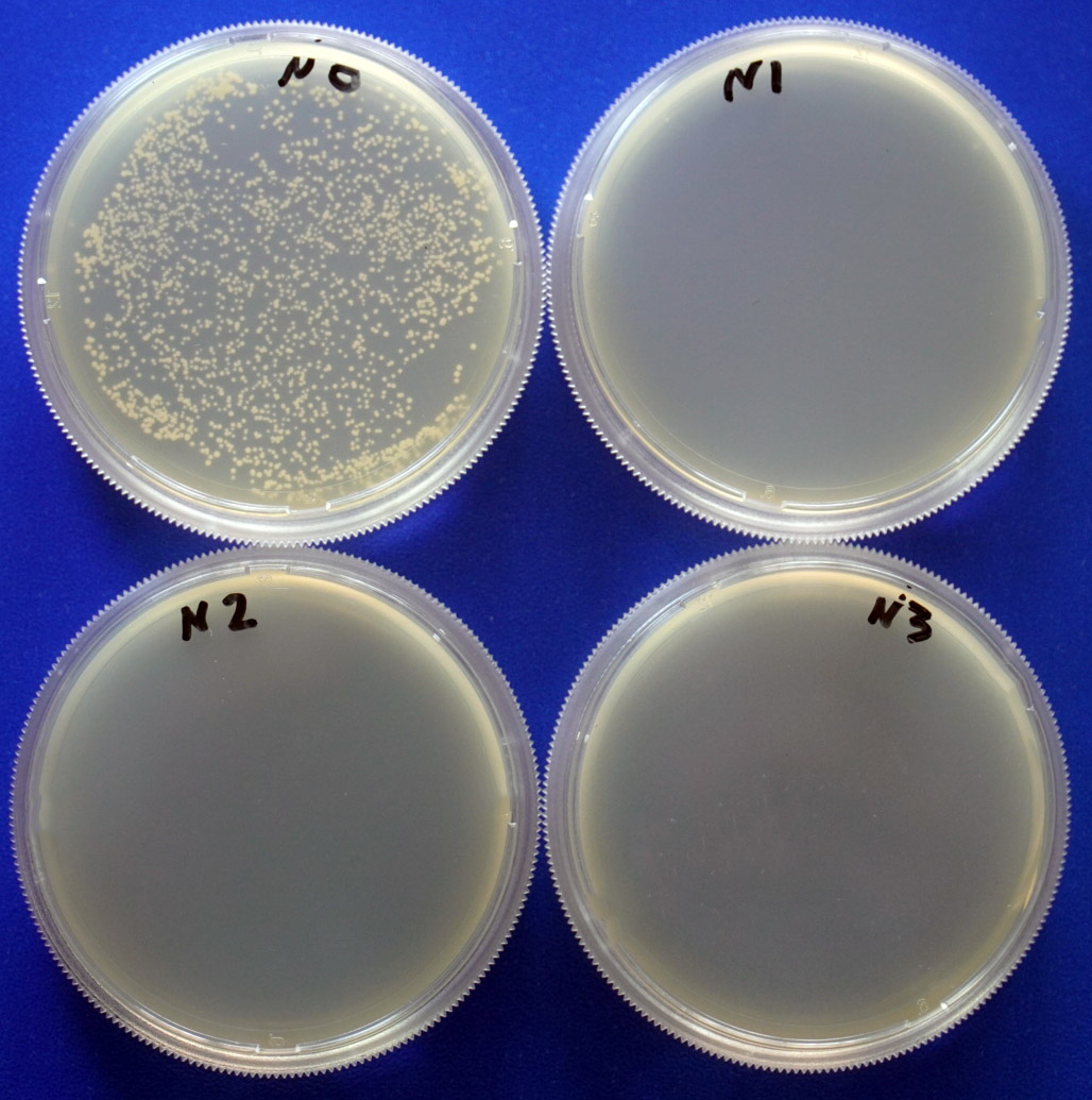 2.1. 對金黃色葡萄球菌的抑制效果(細(xì)菌) 培養(yǎng)基高壓滅菌后,冷卻并添加一定量的Buffpro 300后到平板。凝固后接種同樣菌量的金黃色葡萄球菌,37℃培養(yǎng)18h。結(jié)果如下圖: