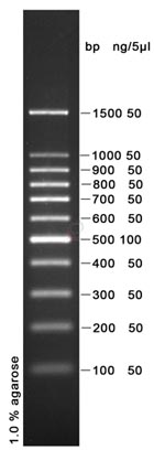 本產(chǎn)品是由11條帶狀雙鏈DNA組成,適用于瓊脂糖凝膠電泳中DNA條帶的分析。本產(chǎn)品為即用型產(chǎn)品,已含有1×loading buffer,可根據(jù)實驗需要,直接取2-5μl電泳,使用方便,電泳圖像清晰。 本產(chǎn)品中11條帶為10020030040050060070080090010001500bp,其中500bp條帶為100ng/5μl,其余條帶濃度為50ng/5μl