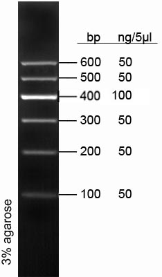 | 描述: | 由100、200、300、400、500、600bp 6條雙鏈線狀DNA片段混合而成。指示帶為400 bp. | ||