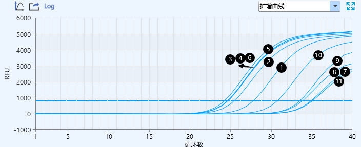 保存24h后保存液 1-11 N基因的擴(kuò)增曲線與CT值27.832;25.488;24.684;24.707;24.293;24.637;34.934;33.848;33.543;30.785;35.090