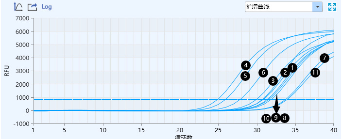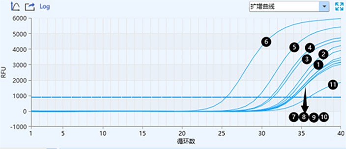 保存120h后保存液1-11 ORF1ab基因的擴(kuò)增曲線與CT值 32.746;32.230;31.918; 30.074;30.246;26.316;33.902;33.293;33.176;31.918 ;35.887
