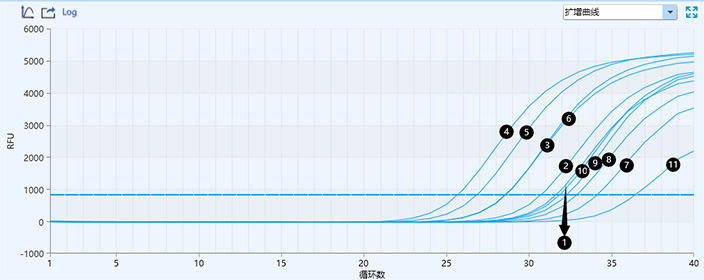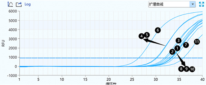 保存72h后保存液 1-11 N基因的擴(kuò)增曲線與CT值 31.660;30.746;28.582;25.699;26.855;28.613;34.137;32.910 ;32.309;31.879;36.434