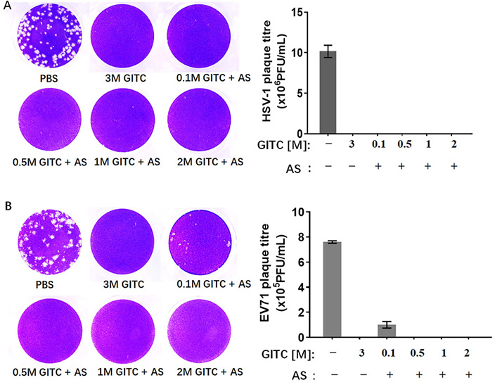 4.結(jié)論 使用本核酸酶抑制劑復(fù)合物的保存液在低至0.1M異硫氰酸胍時比傳統(tǒng)配方的3M異硫氰酸胍的效果還要好,如果用150g/L復(fù)合物與0.5M異硫氰酸胍就顯著優(yōu)于傳統(tǒng)配方。 三、滅活病毒效果測試 用HSV-1與EV71病毒來測試保存液對病毒的滅活效果,測試顯示使用低至0.5M異胍與150g/L的核酸酶抑制劑復(fù)合物能夠有效滅活病毒。