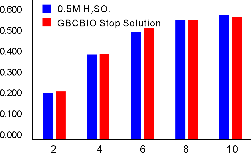 GBCBIO公司Stop Solution For TMB Substrate采用低腐蝕性的有機(jī)酸替代傳統(tǒng)使用2M硫酸作為TMB顯色的終止液,硫酸有強(qiáng)腐蝕性、且是管控危險(xiǎn)化學(xué)品難以購買得到,而本產(chǎn)品為低腐蝕性的有機(jī)酸可以有效避免硫酸的強(qiáng)腐蝕性可能對(duì)人體造成的傷害。需要注意的是本產(chǎn)品作為中強(qiáng)酸,雖然腐蝕性比硫酸弱很多,但還是有一定的腐蝕性,需要注意適當(dāng)防護(hù)。TMB顯色終止液(450nm, 不含硫酸)與傳統(tǒng)的硫酸終止液有一致的線性關(guān)系,操作方式也是一樣,是一種主要用于ELISA等實(shí)驗(yàn)中TMB顯色反應(yīng)終止的比較安全的不含硫酸的即用型酸性溶液。加入本產(chǎn)品后,TMB顯色反應(yīng)會(huì)被終止,并且原來的藍(lán)色溶液會(huì)并轉(zhuǎn)變成在450nm處有較強(qiáng)光吸收的黃色溶液,最終在450nm測定吸光度并且可以使檢測靈敏度比檢測藍(lán)色吸光度提高1倍左右。TMB,即3,3’,5,5’-Tetramethylbenzidine,是辣根過氧化物酶(horseradish peroxidase, HRP)的最常用底物之一。在辣根過氧化物酶或其它適當(dāng)過氧化物酶的催化下,TMB會(huì)產(chǎn)生可溶性藍(lán)色產(chǎn)物,該藍(lán)色產(chǎn)物通常可以在370nm或620-650nm測定吸光度。 由于辣根過氧化物酶與TMB的反應(yīng)在一定時(shí)間內(nèi)能持續(xù)進(jìn)行,若不及時(shí)終止反應(yīng),可能會(huì)由于反應(yīng)達(dá)到平臺(tái)期等而影響實(shí)驗(yàn)結(jié)果。TMB顯色終止液根據(jù)吸光度的檢測分為兩種,一種是在450nm進(jìn)行檢測,一種是在620-650nm進(jìn)行檢測。本TMB顯色終止液加入后溶液顏色從藍(lán)色變?yōu)辄S色,并在450nm測定吸光度,本產(chǎn)品終止反應(yīng)后在1小時(shí)內(nèi)吸光度保持穩(wěn)定。