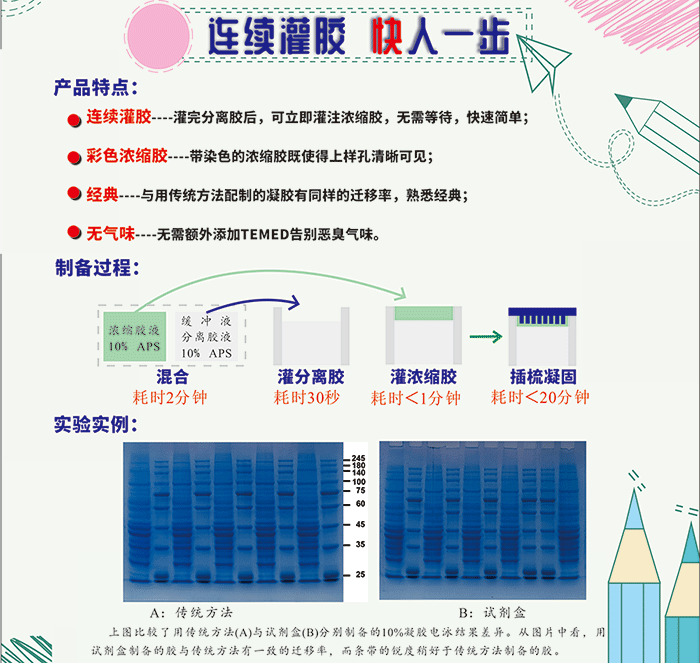 產(chǎn)品特點(diǎn): ※ 連續(xù)灌膠-----灌完分離膠后,可立即灌注濃縮膠,無(wú)需等待; ※ 彩色濃縮膠-----紅色的濃縮膠既使得上樣孔清晰可見(jiàn),也在能監(jiān)測(cè)電泳與電轉(zhuǎn)狀況; ※ 經(jīng)典-----與用傳統(tǒng)方法配制的凝膠有同樣的遷移率,熟悉經(jīng)典; ※ 無(wú)氣味------無(wú)需額外添加TEMED,告別惡臭氣味。