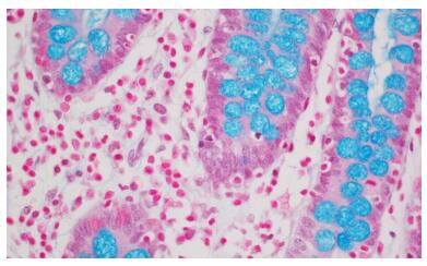4. Rinse slide briefly (10-30 seconds) in Acetic Acid Solution to remove excess Alcian Blue.